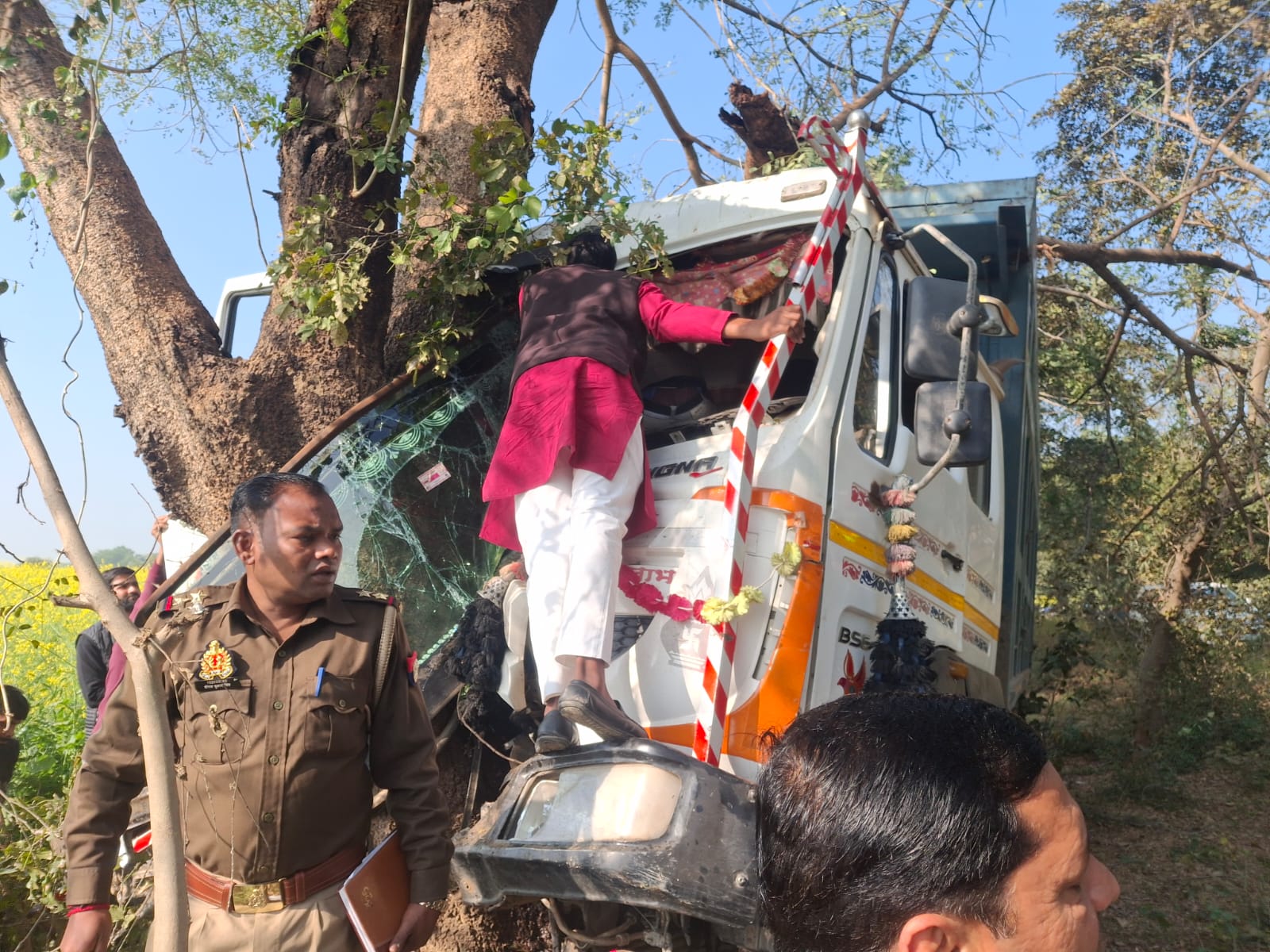 रामनगरिया के पास ट्रक पेड़ से टकराया, चालक केबिन में फंसा—पुलिस व ग्रामीणों की मदद से रेस्क्यू