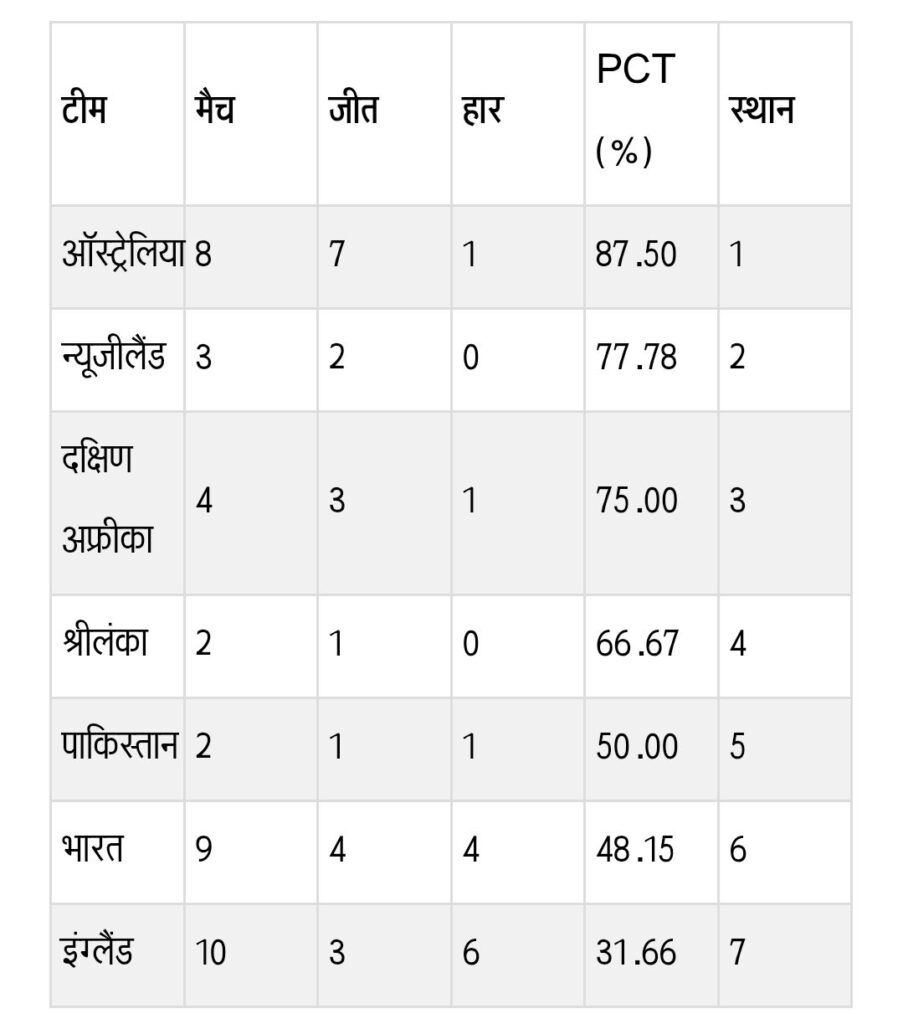 दरअसल, सिडनी क्रिकेट ग्राउंड में खेले गए एशेज सीरीज के पांचवें और आखिरी टेस्ट मैच में 5 विकेट से जीत के बाद कंगारूओं का दबदबा डब्ल्यूटीसी अंक तालिका में बरकरार रहा। गत चैंपियन ऑस्ट्रेलिया ने 87.50 के अंक प्रतिशत (PCT) के साथ टॉप पर अपनी स्थिति मजबूत कर ली है। सीरीज की शुरुआत से पहले उनका पीसीटी 85.71 का था।
